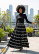 Cette jupe longue en tissu africain bleu nuit est sublimée par des motifs géométriques blancs délicats. Sa taille haute élastiquée assure un ajustement parfait et confortable, tandis que sa coupe fluide allonge la silhouette avec élégance.