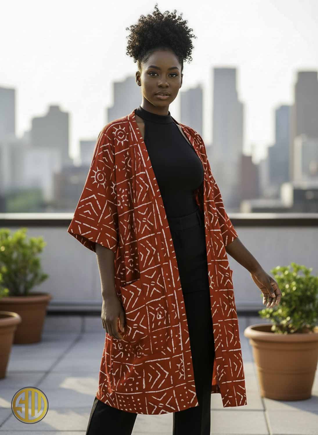 Kimono africano rojo con estampados bogolan: estilo moderno y étnico.