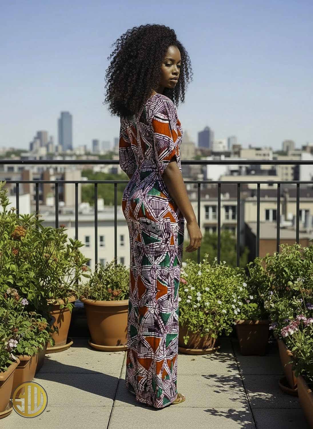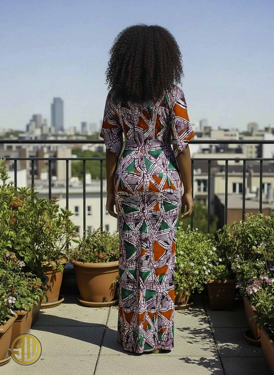 Robe Longue Wax Femme – Coupe Élégante Fente Avant – Motif Géométrique Multicolore